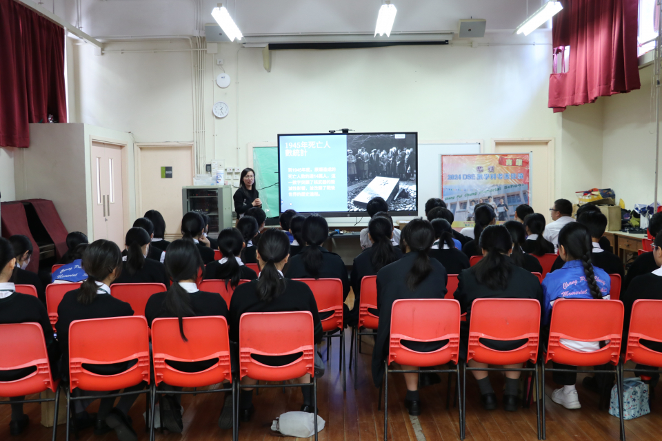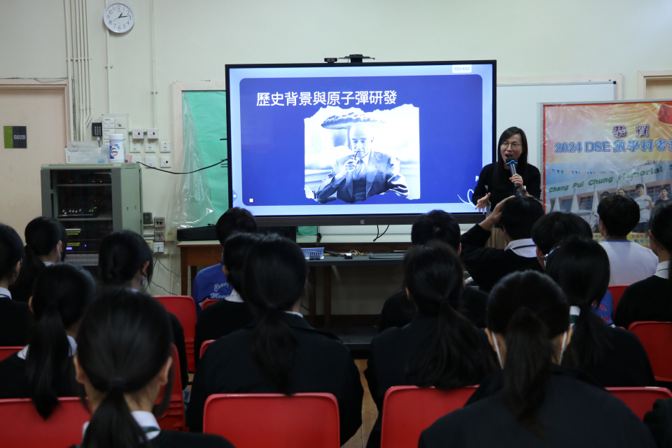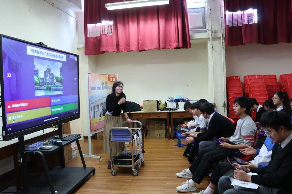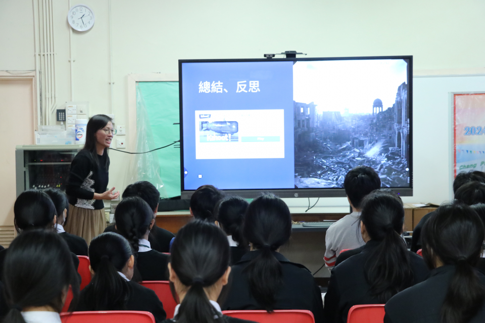 中史老師向同學講解二戰歷史和原子彈研發過程,透過影片和反思問題,讓同學了解原子彈爆發帶來的影響,藉此反思戰爭與和平的訊息。觀看影片後,同學又參與Kahoot!問答,鞏固記憶。
