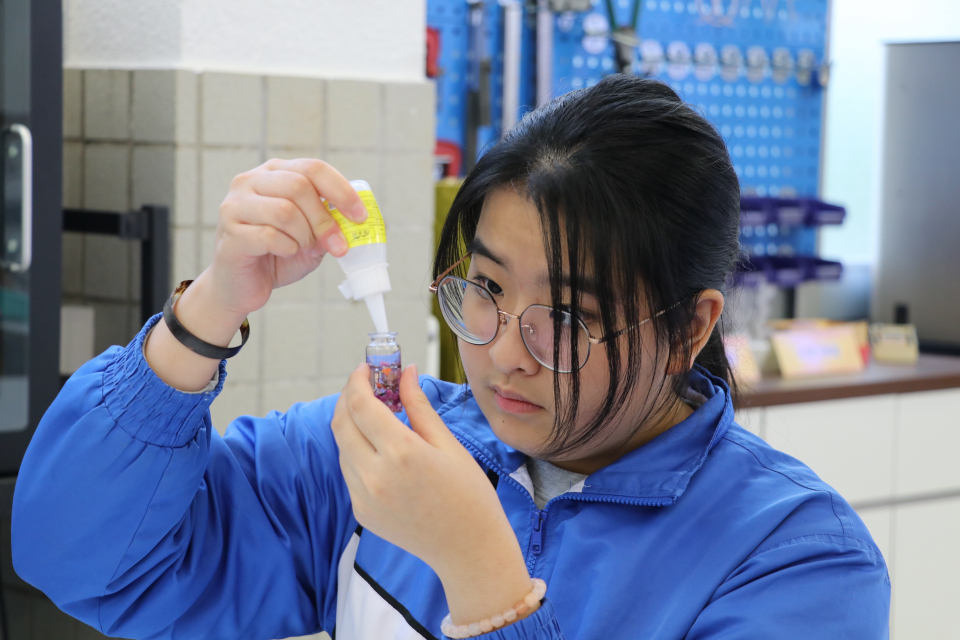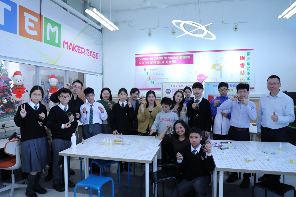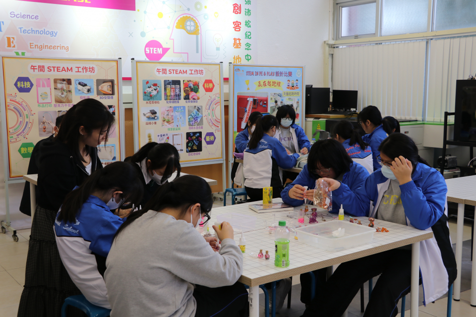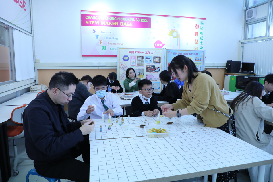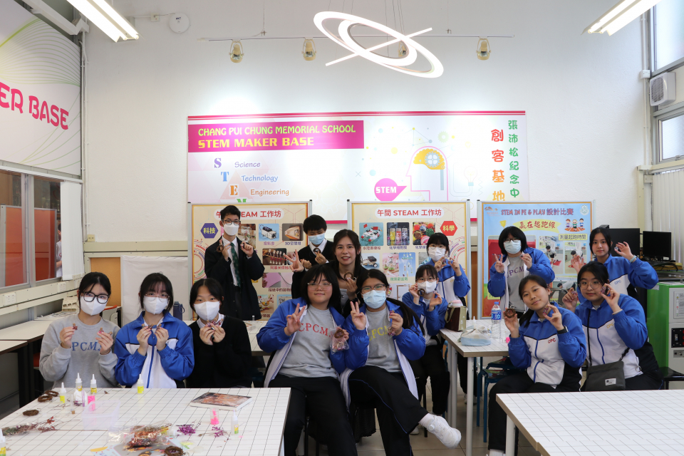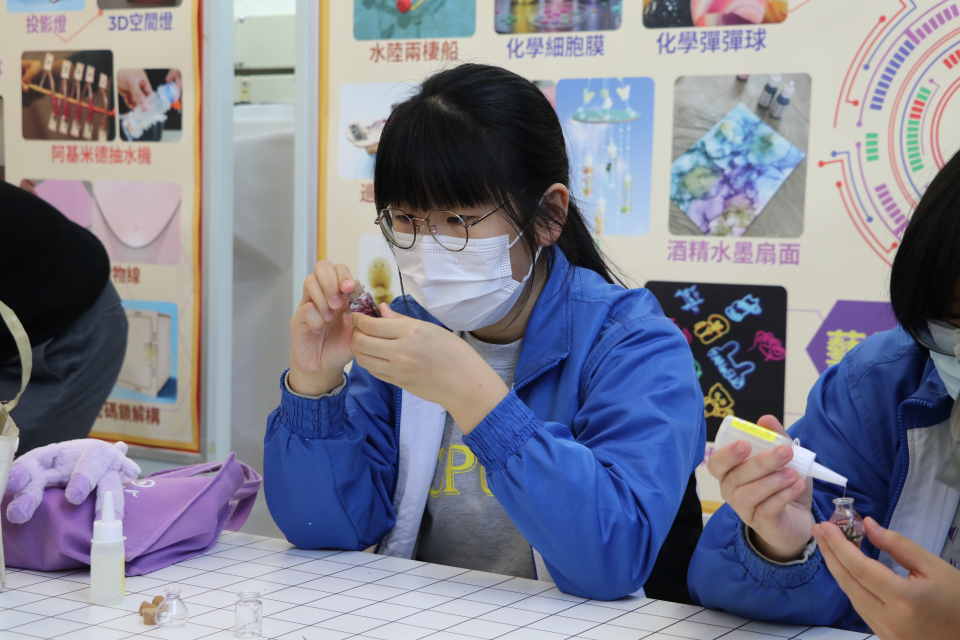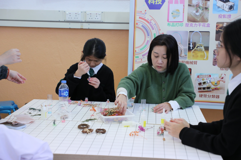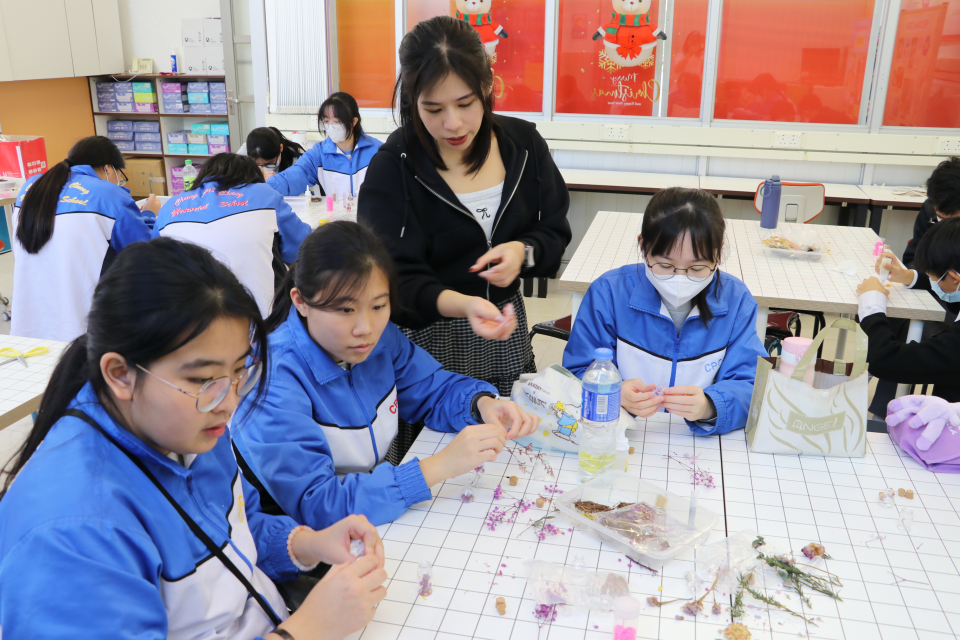 同學與老師一同製作鮮花風鈴手工,將彩砂、鮮花、圖紙等放入玻璃瓶,再以膠水固定,製作為永生花玻璃瓶,並繫到風小竹藤風鈴上。同學發揮創意,選取適當色系的材料,設計特色主題的繽紛小空間。