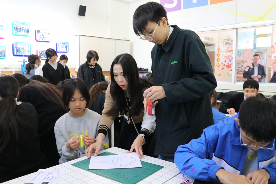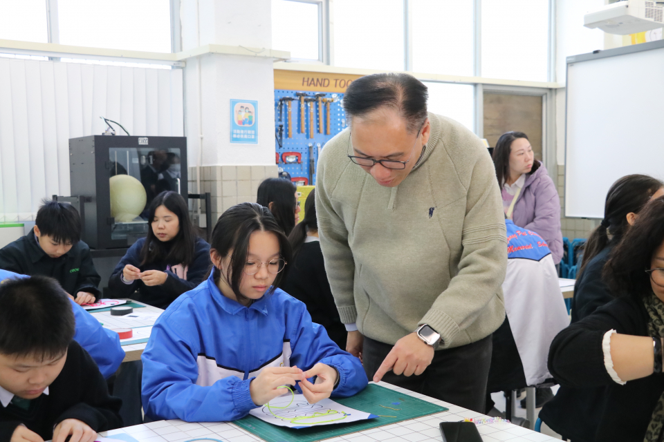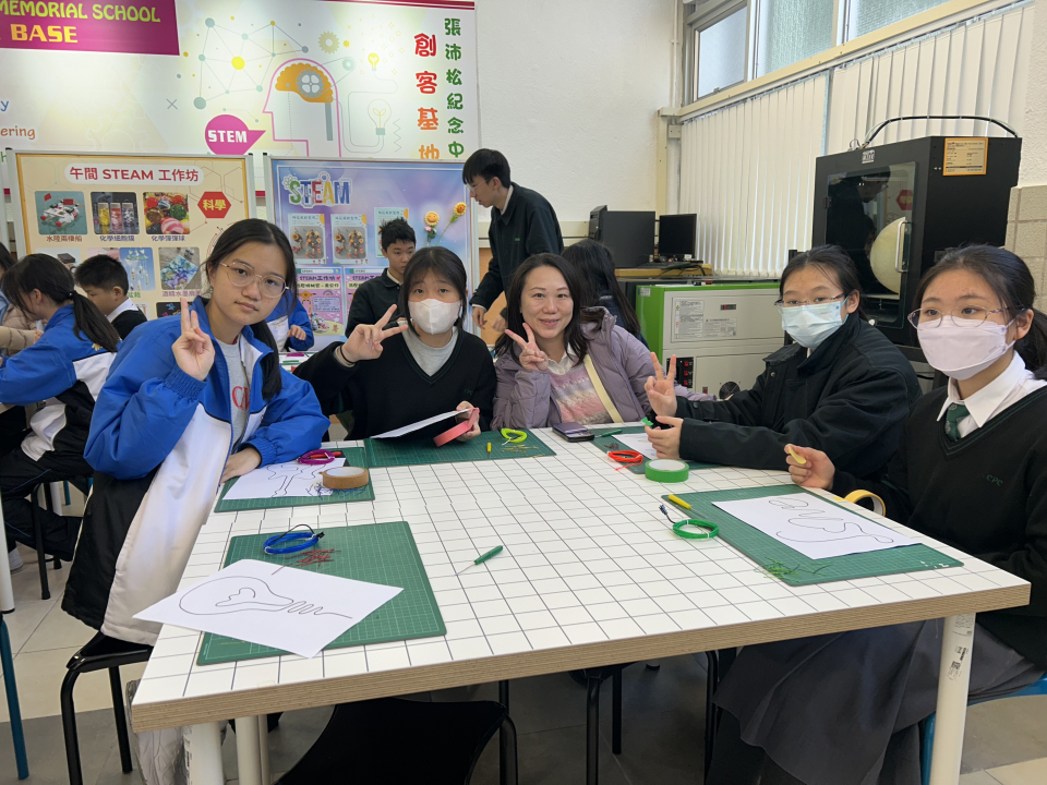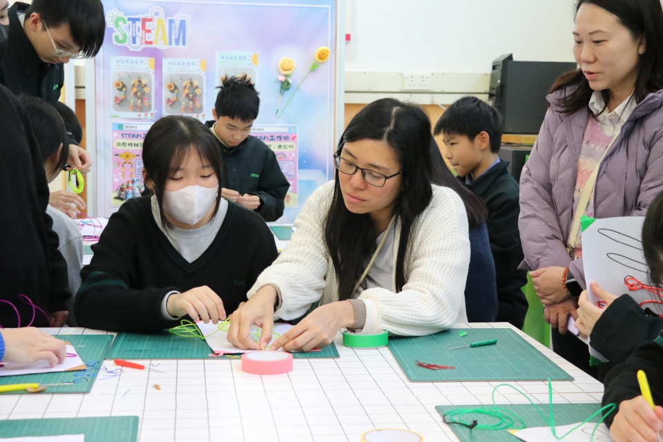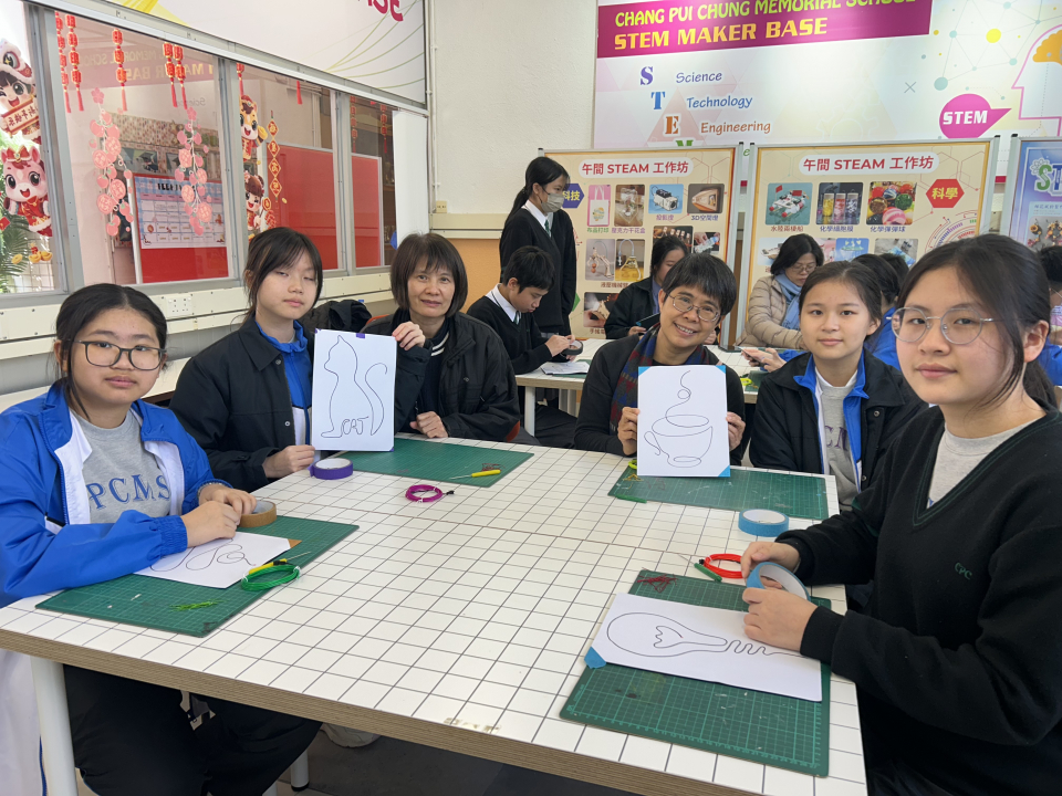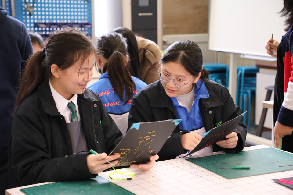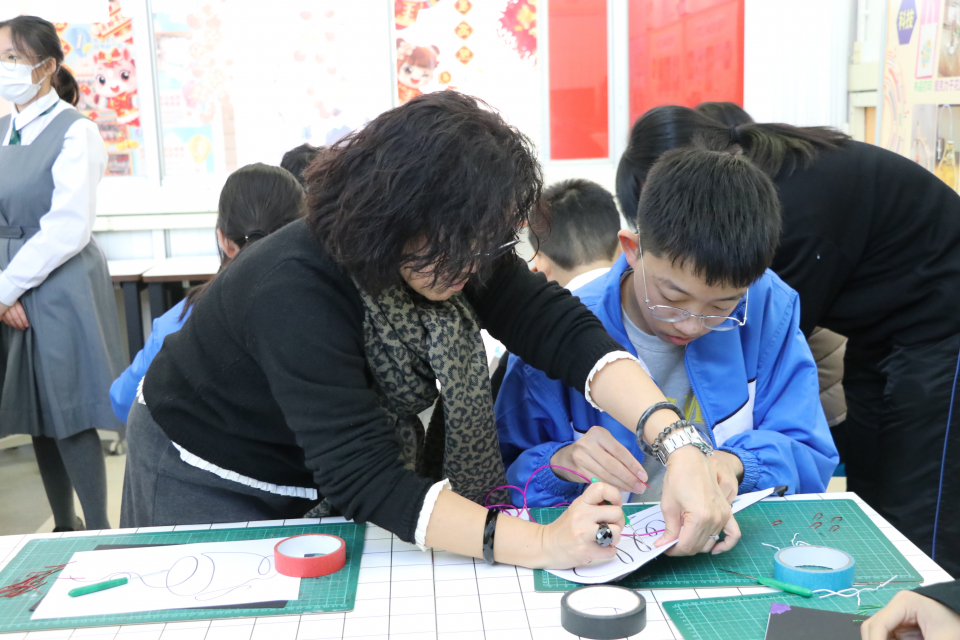 視覺藝術科舉辦「霓虹燈扭線工作坊」,讓同學體驗這項充滿本土特色的工藝。同學先在畫紙上勾勒出流暢的單線圖案,再耐心將霓虹燈冷光線沿著線條扭動固定。過程中,同學不單要發揮創意,更要細心拿捏曲線的弧度